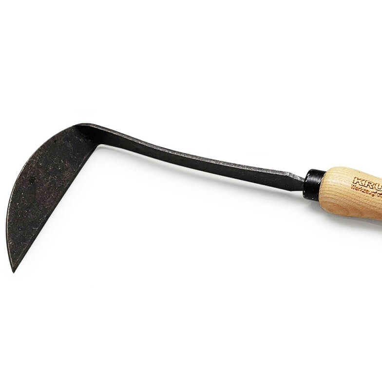 Die Japanische Sichelhacke Nr. 1734 von Krumpholz ist ein beliebtes Gartenwerkzeug für die Arbeit in Gemüse- und Staudenbeeten. Das geschmiedete Messer ist am Ende leicht abgewinkelt und hat eine geschliffene Kante. Durch waagerechtes Ziehen schneidet es lästige Unkrautwurzeln ab. Gedreht pflügt es ein Furche und lockert den Boden. Durch den längeren Stiel ist es auch perfekt für die Arbeit in Hochbeeten.