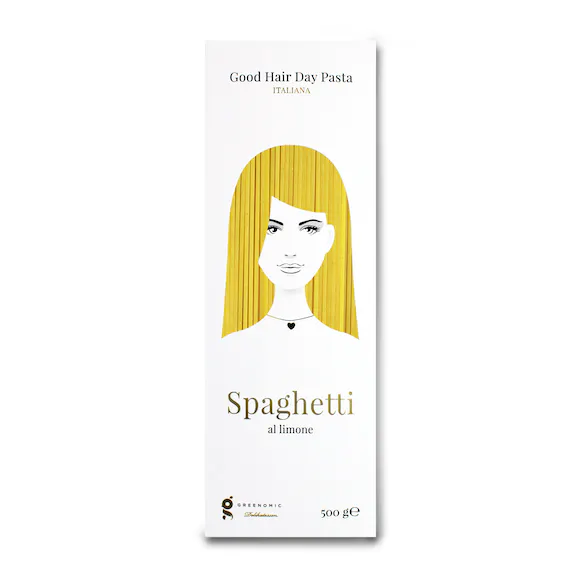 Good Hair Day Pasta ist eine Anspielung auf den bekannten und wenig beliebten bad hair day. Originell verpackt is diese Pasta gleichzeit eine Premiumpasta. Hergestellt im traiditonellen Brozeverfahren mit Zitrone.