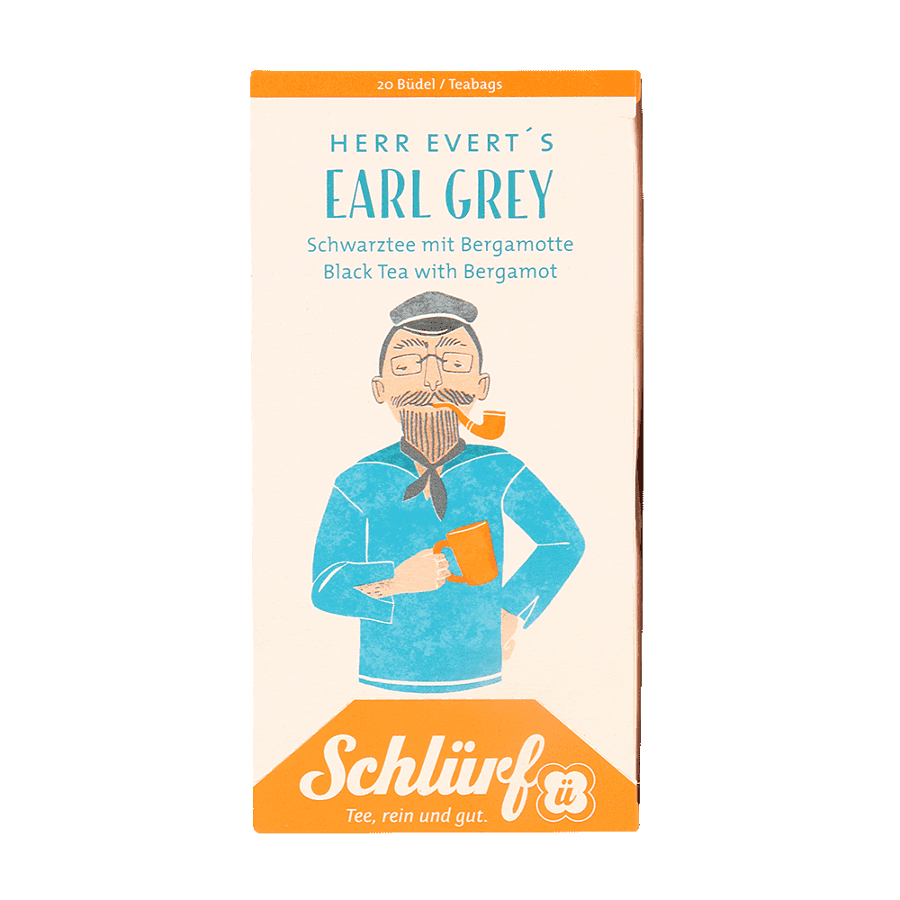 Herr Evert´s Earl Grey ist ein kräftiger Schwarztee mit Bergamotte-Geschmack. Seiner dunklen Tasse entströmen betörende Orangennoten. Hoch geschätzt bei Kapitänen. Gern geklaut von Küchenjungen.