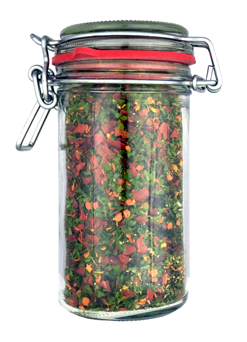 Inhalt:getrocknete Tomaten, Meersalz, Petersilie, Knoblauch, Stangensellerie (Setano), Zwiebeln, Minze, roter Pfeffer