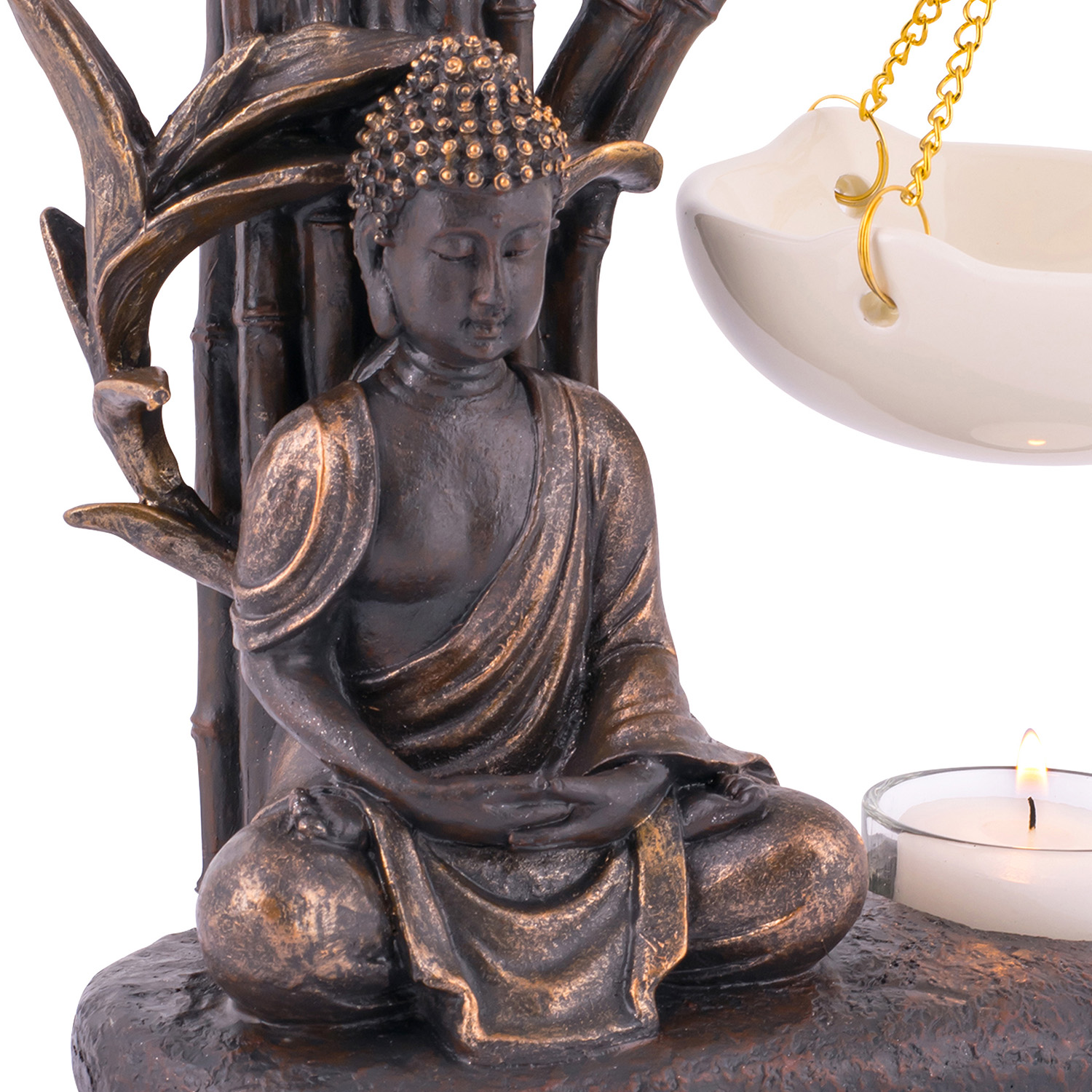 Diese Duftlampe ist eine kreative Idee, die optimal umgesetzt wurde. Dabei sitzt der Buddha auf dem Boden im Schneidersitz direkt neben dem Teelicht, das für den schönen Duft im Raum verantwortlich ist. Dies ist eine gute Kombination einer schönen Dekoration und einem wunderbar duftenden Aroma.
