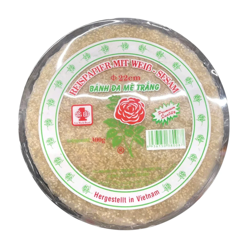 Dieses Reispapier mit weißem Sesam (300g) ist ideal für die Zubereitung von köstlichen und gesunden vietnamesischen Frühlingsrollen. Es wird aus hochwertigem Reismehl hergestellt und ist mit weißen Sesamsamen verfeinert, die dem Reispapier einen einzigartigen, nussigen Geschmack verleihen. Es hat eine dünne, aber dennoch stabile Textur, die nach dem Einweichen in Wasser weich und flexibel wird und sich leicht zum Einrollen von frischen Zutaten eignet. Perfekt für sowohl kalte als auch frittierte Gerichte, ist dieses Reispapier eine vielseitige Zutat in der asiatischen Küche.